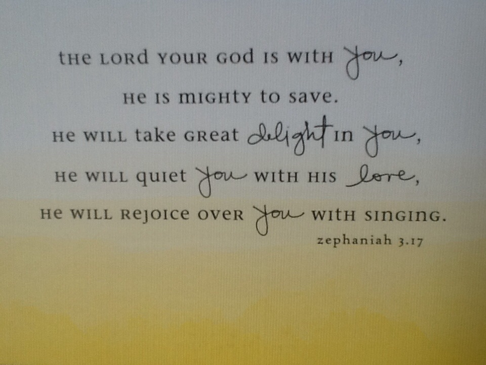 “The Lord your God is with you, He is mighty to save. He will take great delight in you, He will quiet you with His love, He will rejoice over you with singing.” Zephaniah 3:17